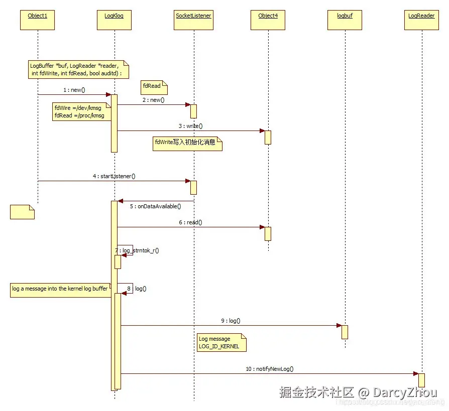 LogKlog创建后,启动listener,调用onDataAvailable(),与logd.klog建立连接,最终调用log()把日志存入kernel buffer。