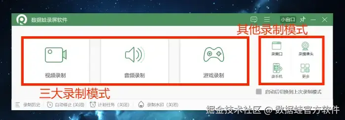 步骤2: 打开软件,选择适合你的录制模式(本文以 “视频录制” 为例)。