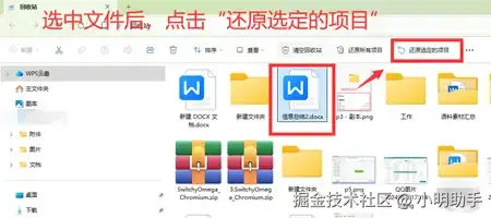 双击打开电脑桌面上的“回收站”,在里面查找误删的word文档。找到后选中,再点击上面的“还原选定的项目”。