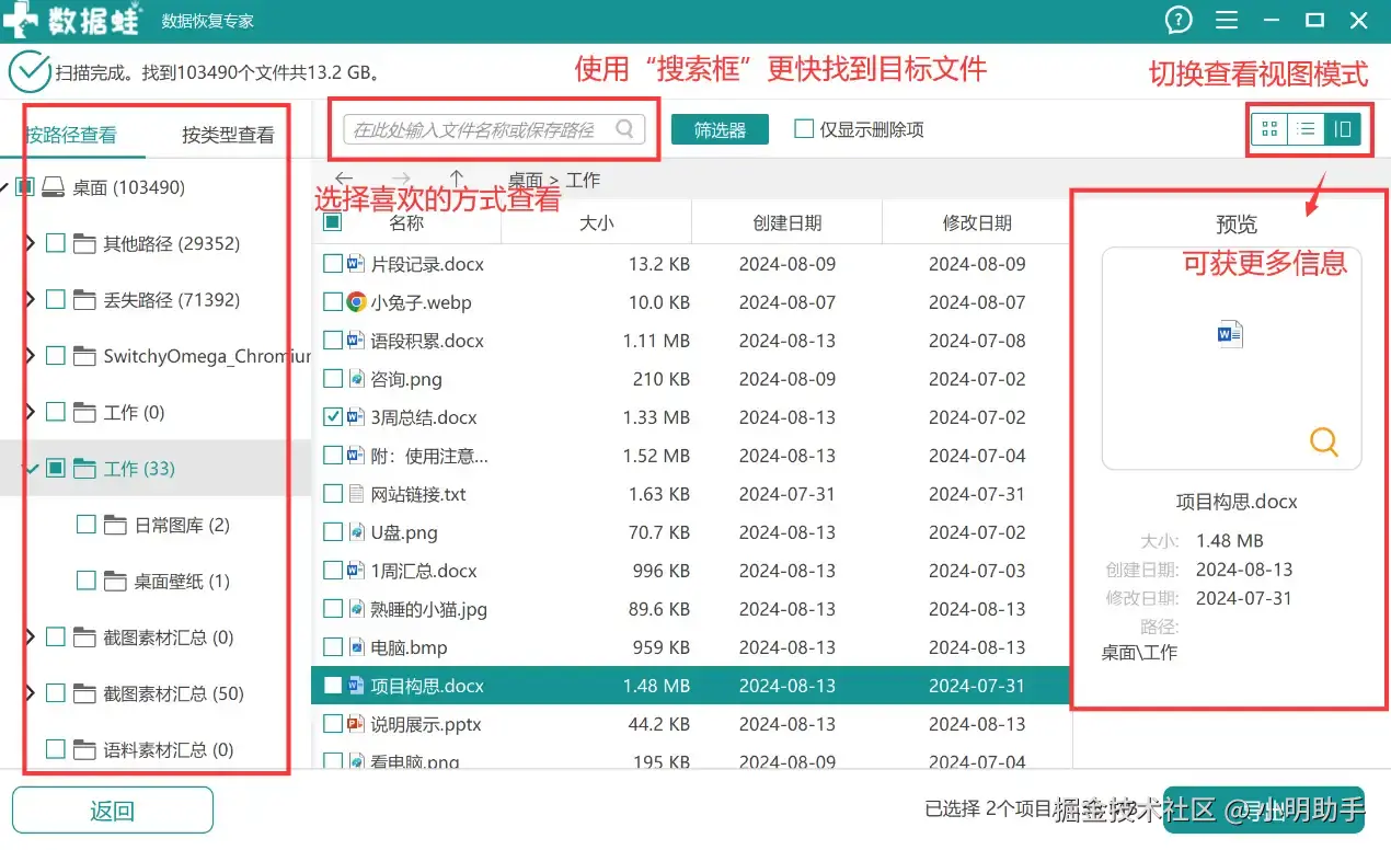 步骤2:等待扫描结果出现完毕,可以在左边选择“按类型查看”或“按路径查看” ,也可以选择使用搜索框直接依据文件名精准定位目标文件。