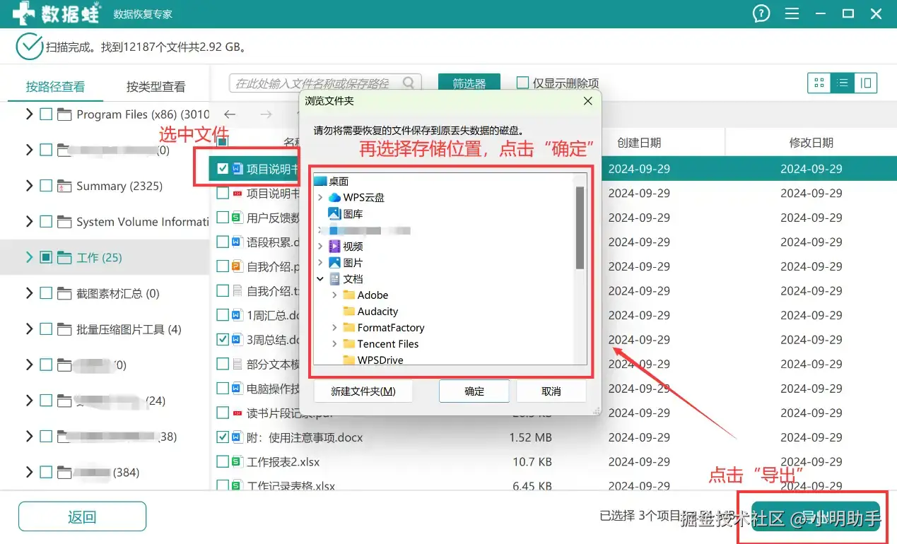 步骤3:找到需要恢复的文档后,选中并点击右下角的“导出” ,再为需要恢复的文件选好存储位置即可。