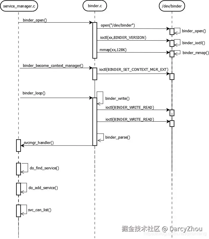 ServiceManager本身的工作很简单:注册服务、查询服务、列出所有服务,启动一个死循环来解析Binder驱动读写动作,进行事务处理。
