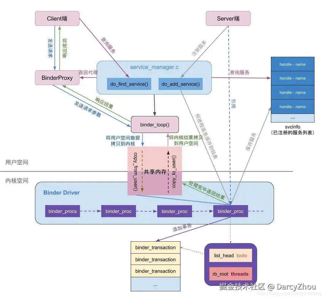 - 拿到服务对象后,我们需要向服务发送请求,实现我们需要的功能。通过 BinderProxy 将我们的请求参数发送给 内核,通过共享内存的方式使用内核方法 copy_from_user() 将我们的参数先拷贝到内核空间,这时我们的客户端进入等待状态。然后 Binder 驱动向服务端的 todo 队列里面插入一条事务,执行完之后把执行结果通过 copy_to_user() 将内核的结果拷贝到用户空间(这里只是执行了拷贝命令,并没有拷贝数据,binder只进行一次拷贝),唤醒等待的客户端并把结果响应回来,这样就完成了一次通信。