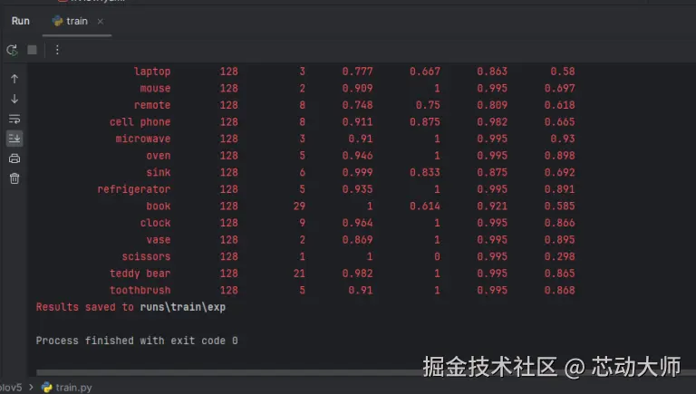 运行成功后如图,训练结果保存在runs\train\exp文件夹里。