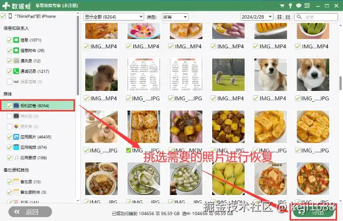 步骤2:扫描完成后,我们在扫描结果中选择 【相机胶卷】 ,可以预览并勾选你需要恢复的照片。勾选照片后,点击 【导出】 恢复到电脑上。