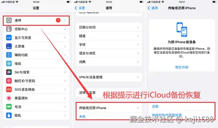步骤2:在苹果手机上,怎么把iCloud照片恢复至iPhone呢?按顺序点击【设置】>【通用】>【还原】>【抹掉所有内容和设置】后,根据提示选择从iCloud备份恢复照片。