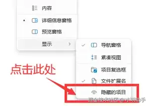 打开U盘,在U盘的文件资源管理器上,点击“查看”,然后把鼠标的箭头放在“显示”上,就能看见“隐藏的项目”选项,然后点击,就能让被隐藏的文件重新显示出来了。