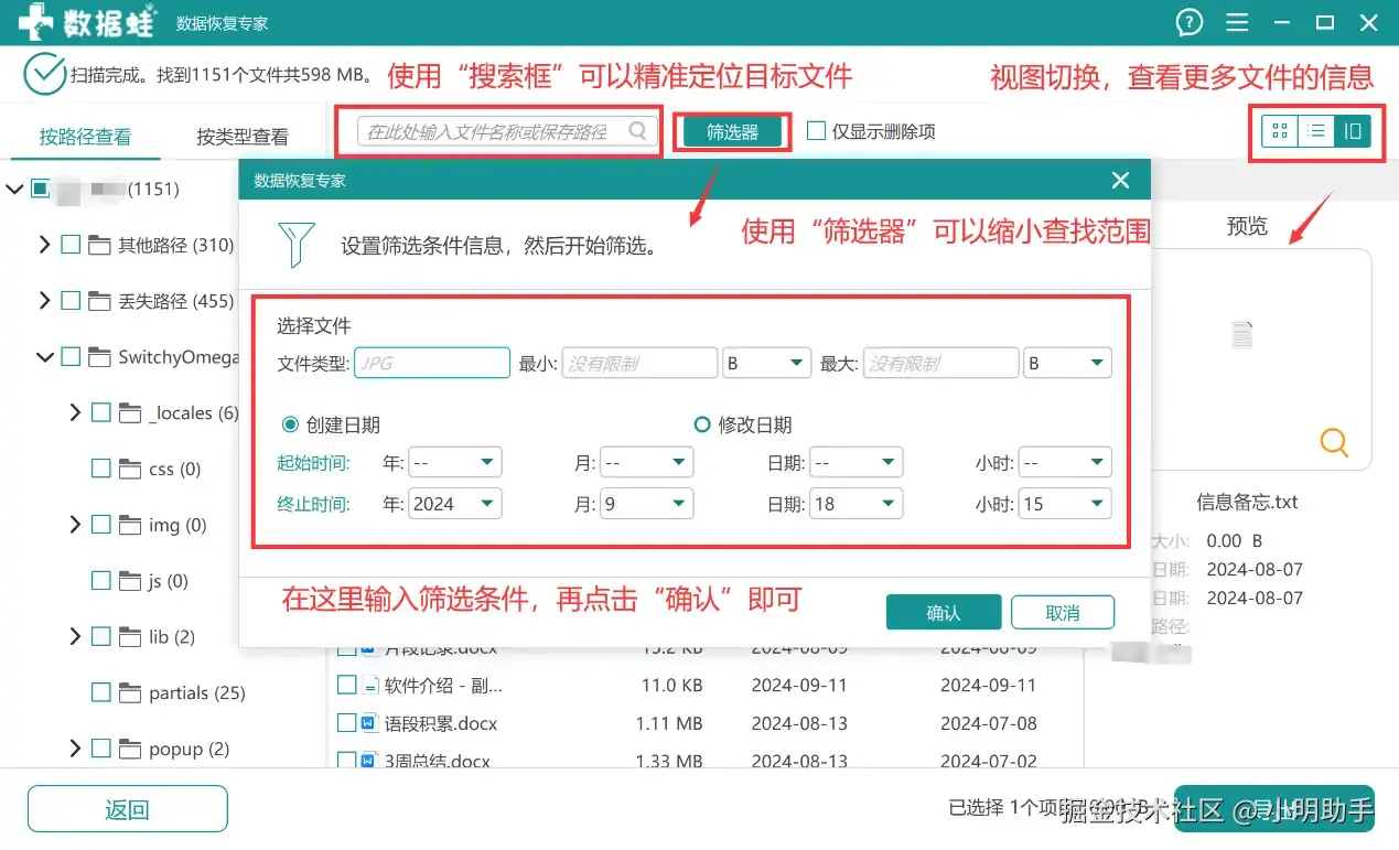 第2步: 进入扫描完成的界面后,可以选择软件配备的工具帮助用户更快找到需要恢复的文件。