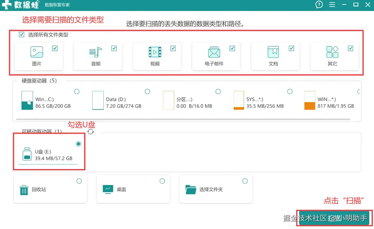 第1步: 确保U盘连上电脑后,点开软件,在主页面勾选上扫描文件的类型和U盘,点击“扫描”。