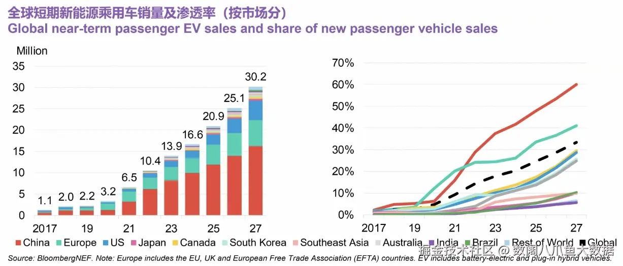 图:全球新能源乘用车销量及渗透率 资料来源:彭博新能源财经,36氪
