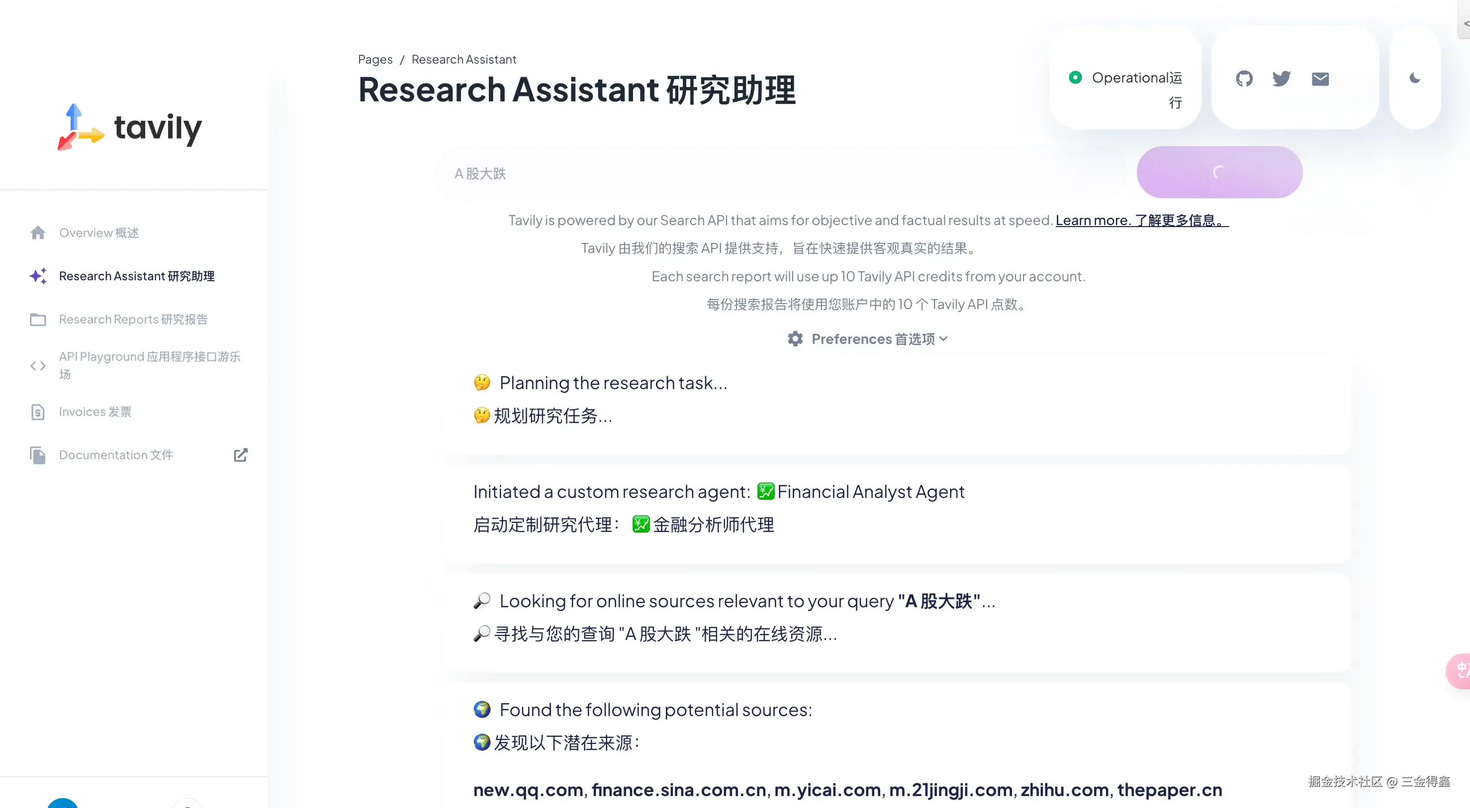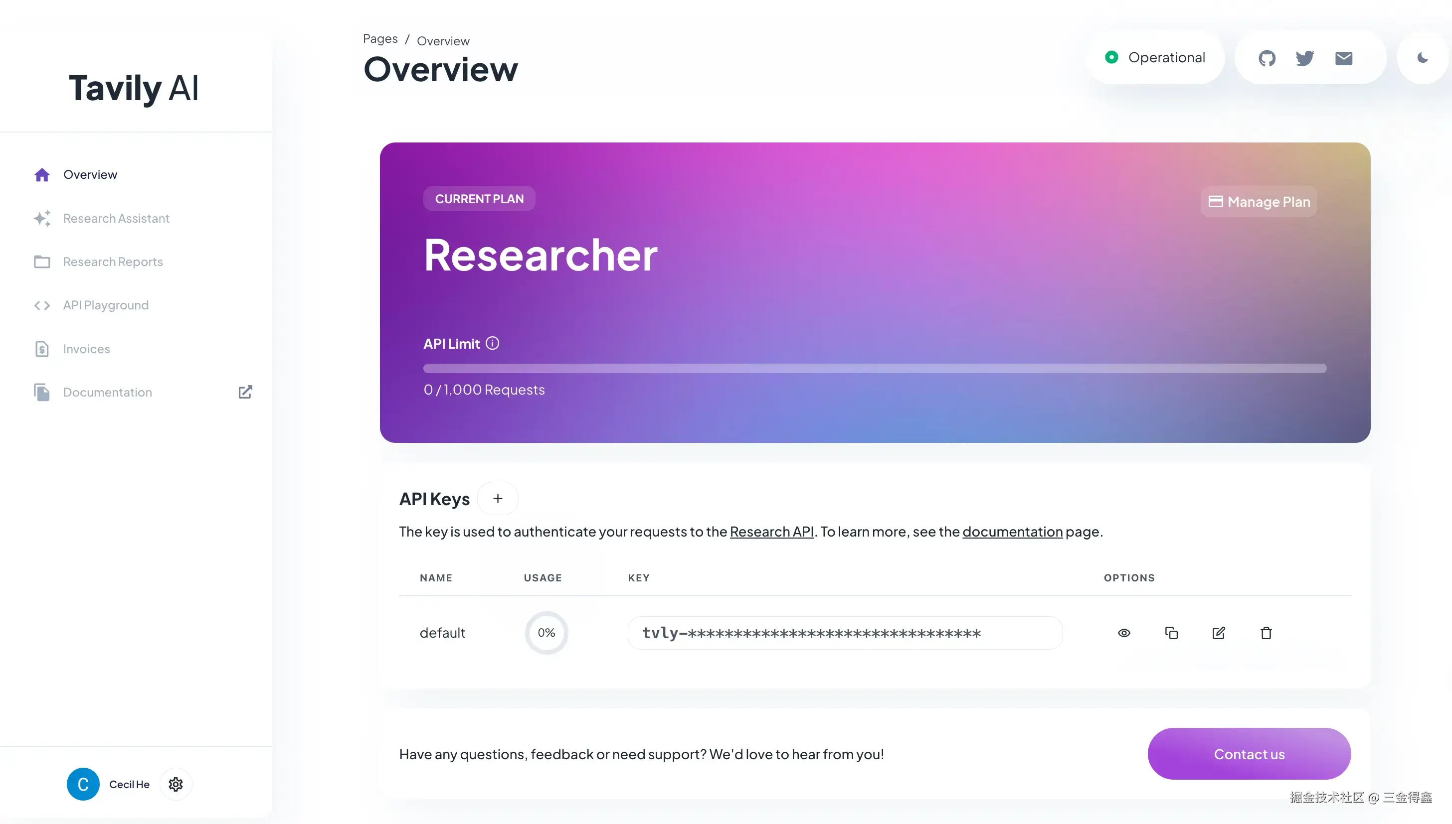 除了 API Key 之外,Tavily 还提供了研究助理「Research Assistant」的功能: