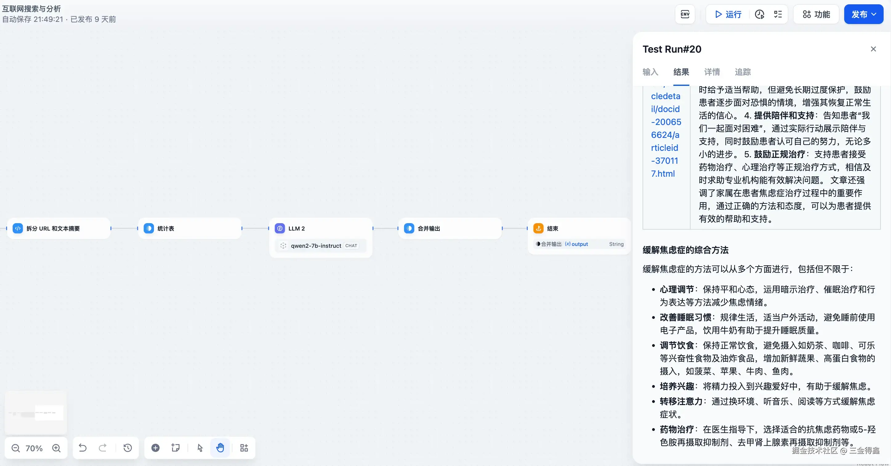 最后,三金在结束节点之前还增加了一个 LLM 节点,用来对搜索的所有内容做一个总结: