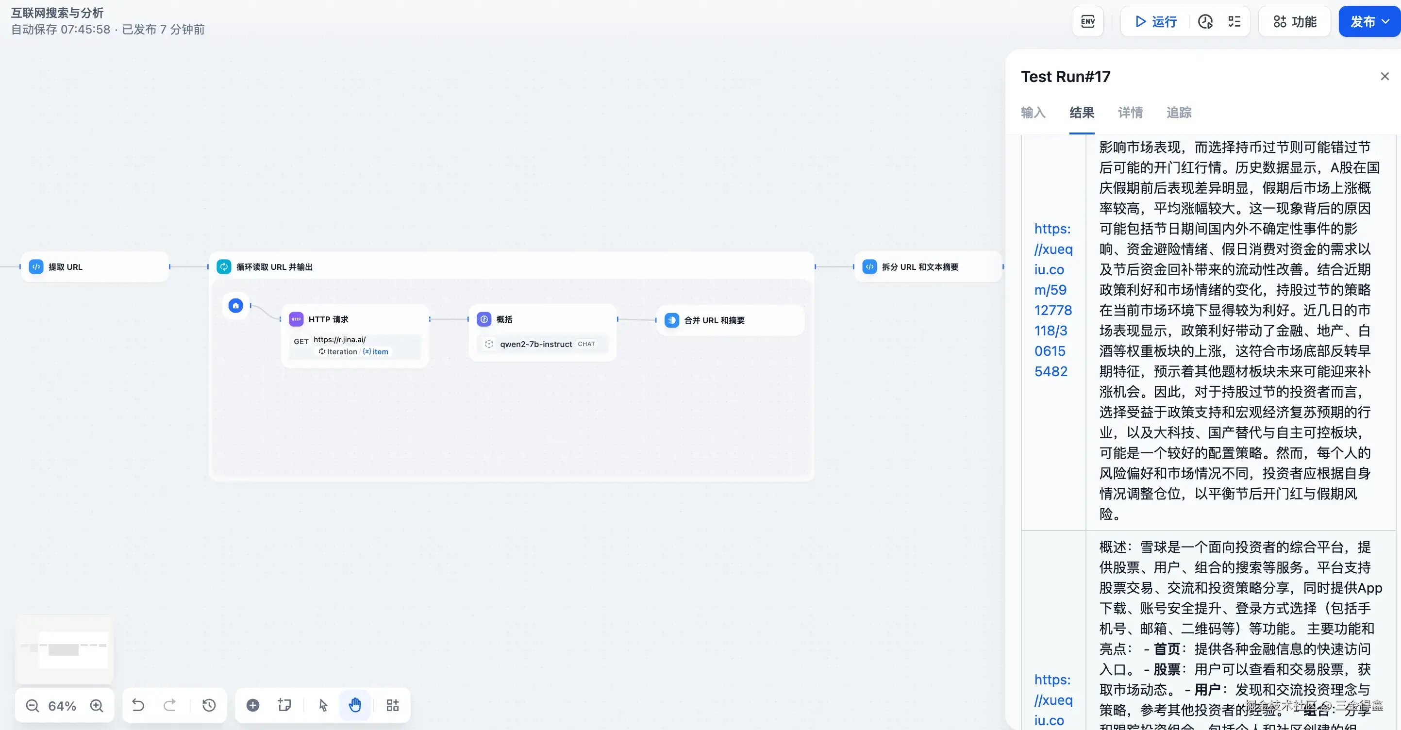 - HTTP 请求:使用 Jina Reader 来爬取对应 URL 的内容并输出到下一个 LLM 节点;