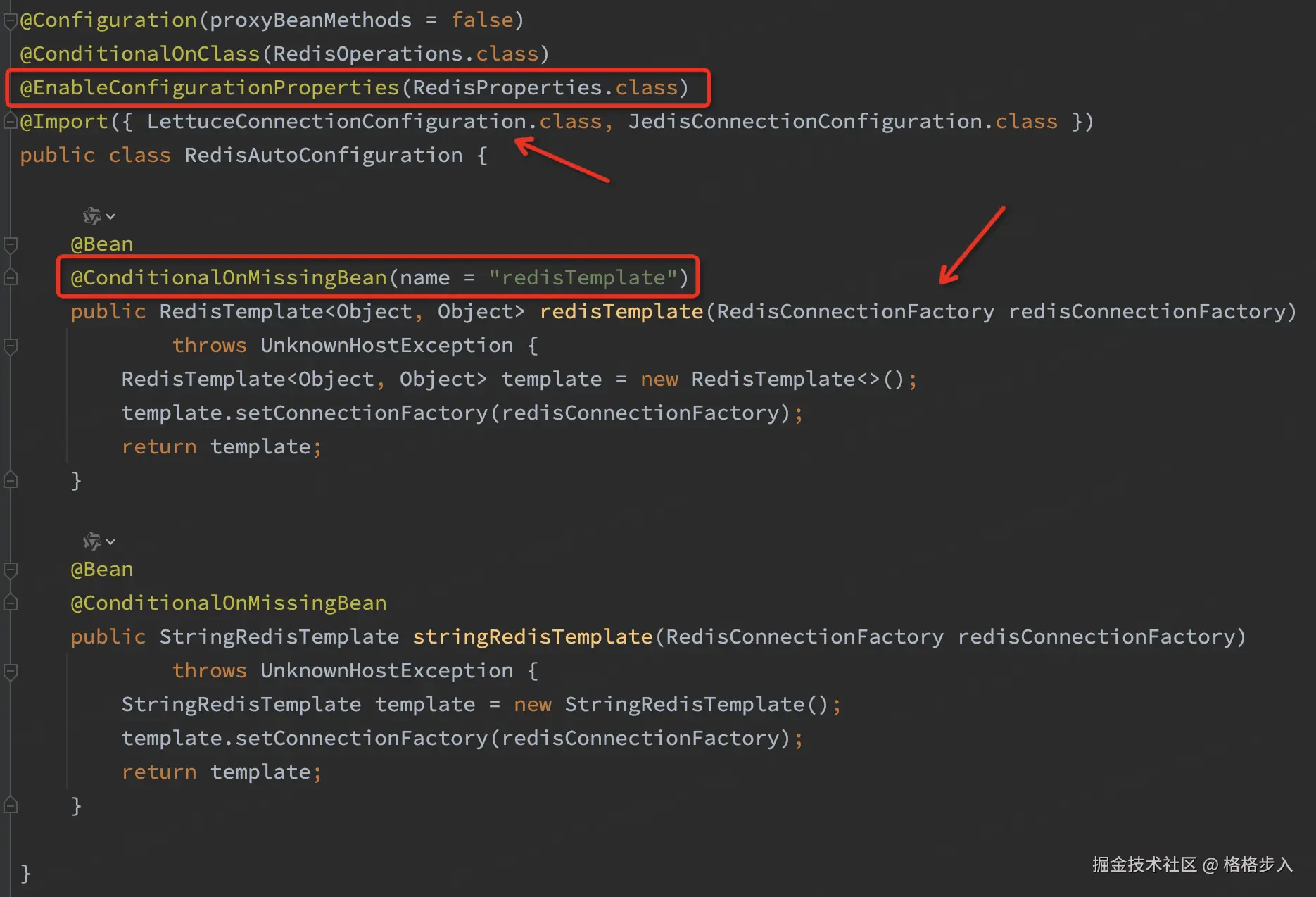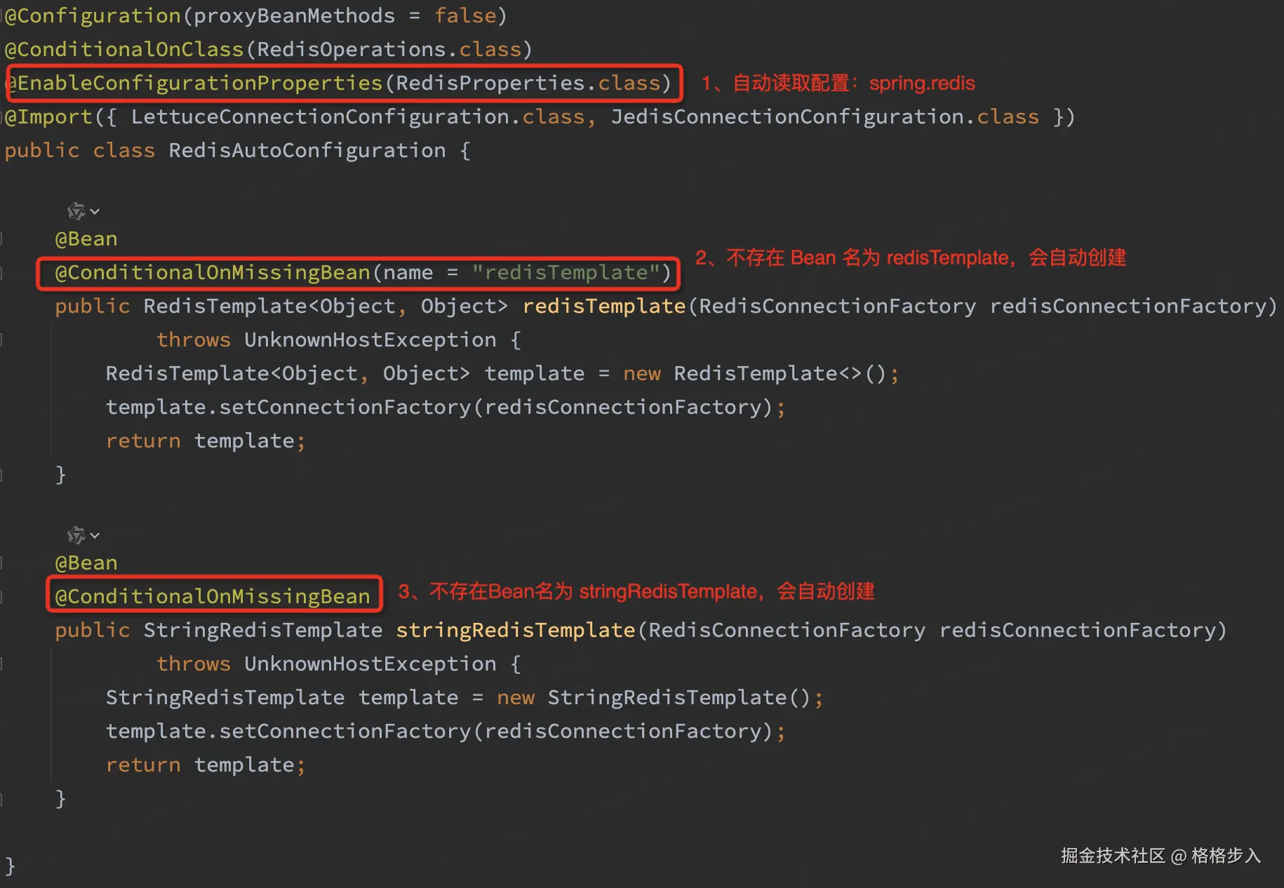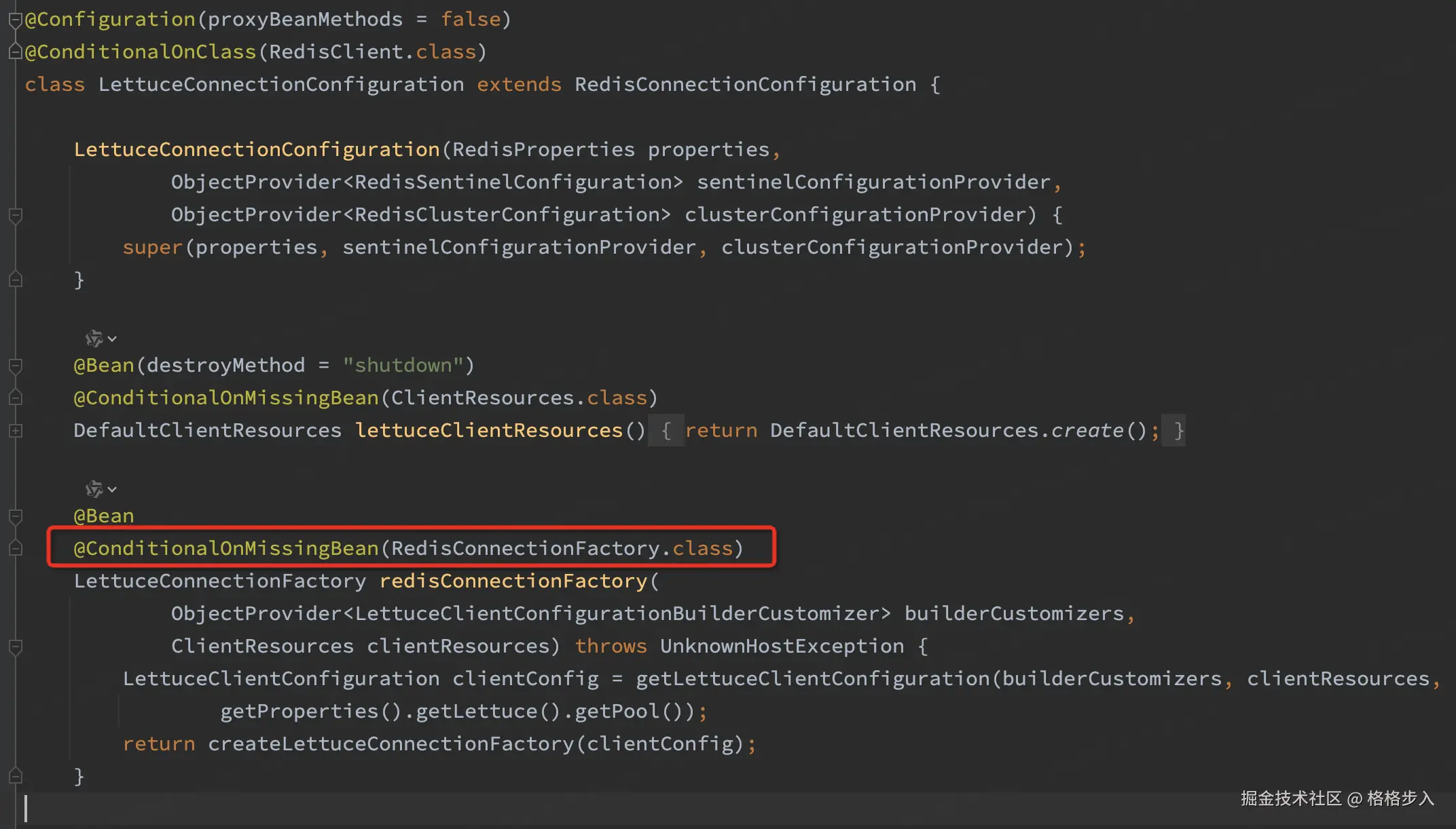 Spring上下文中不存在RedisConnectionFactory类型的Bean时,才会创建被该注解修饰的Bean。 - 所以有第二个配置,原先默认配置就失效了。