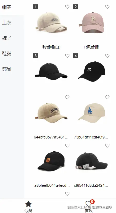 1-鸭舌帽(白).jpg:内部图片同理,1-可以选择作为排序,也可以作为编号,会展示在内容的左上角;- 假如你不想展示具体名称,你可以直接定义