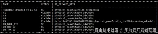 列元数据中C3列的名字已经修改为了 '!hidden!_dropped_v2_p5_C3'。v2代表在表version为2的时候删除的,p5表示此列的physical_pos为5。