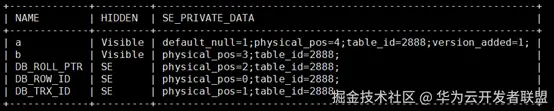 新建表列元数据如上图所示,HIDDEN列表示可见性。三个系统列的可见性为SE,代表INNODB可见,SERVER层不可见。SE_PRIVATE_DATA中也只记录着table_id。