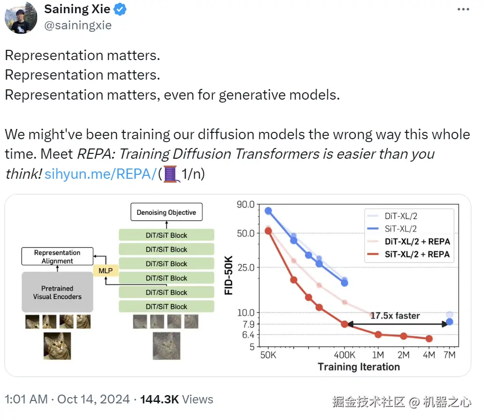 是什么让纽约大学著名研究者谢赛宁三连呼喊「Representation matters」?他表示:「我们可能一直都在用错误的方法训练扩散模型。」即使对生成模型而言,表征也依然有用。基于此,他们提出了 REPA,即表征对齐技术,其能让「训练扩散 Transformer 变得比你想象的更简单。」