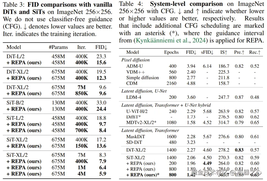 最后,该研究比较了普通 DiT 或 SiT 模型与使用 REPA 训练的模型的 FID 值。