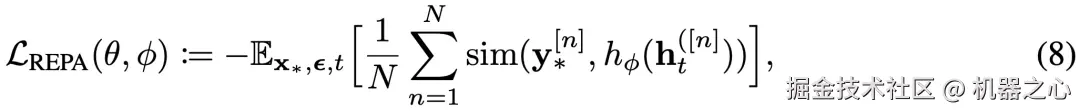 特别地,REPA 通过最大化预训练表征 y* 和隐藏状态 h_t 之间的 patch-wise 相似性来实现对齐,其中 n 是 patch 索引,sim (・, ・) 是预定义的相似度函数。
