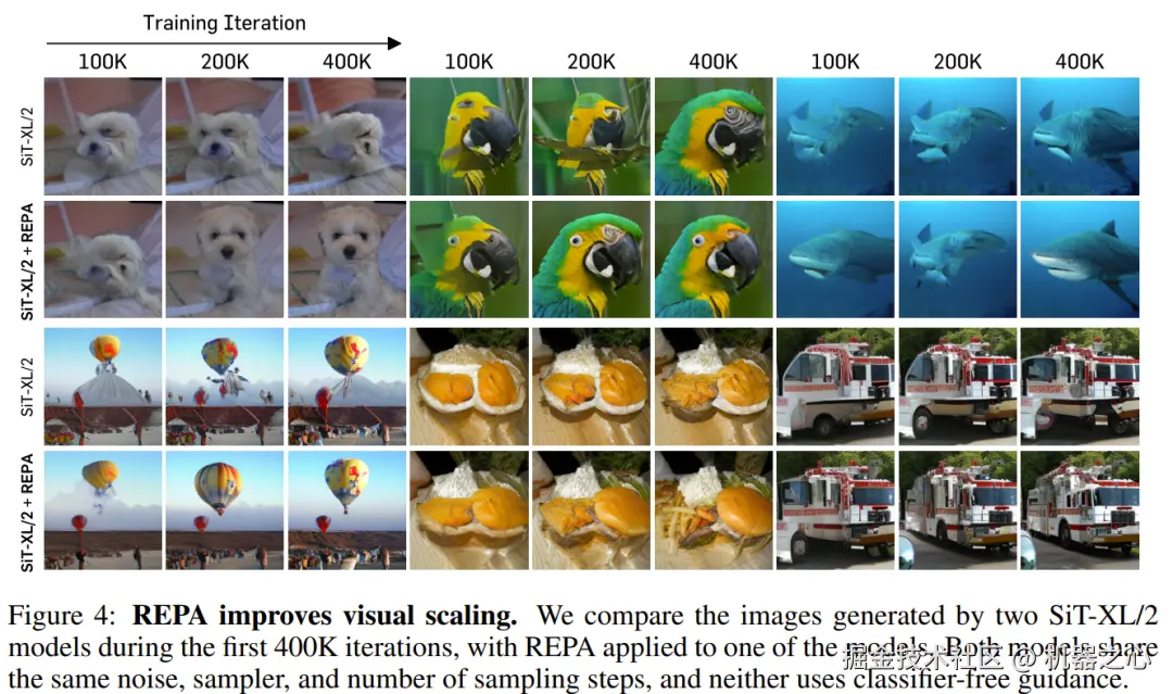该研究首先比较两个 SiT-XL/2 模型在前 400K 次迭代期间生成的图像,其中一个模型应用 REPA。两种模型共享相同的噪声、采样器和采样步骤数,并且都不使用无分类器引导。使用 REPA 训练的模型表现更好。