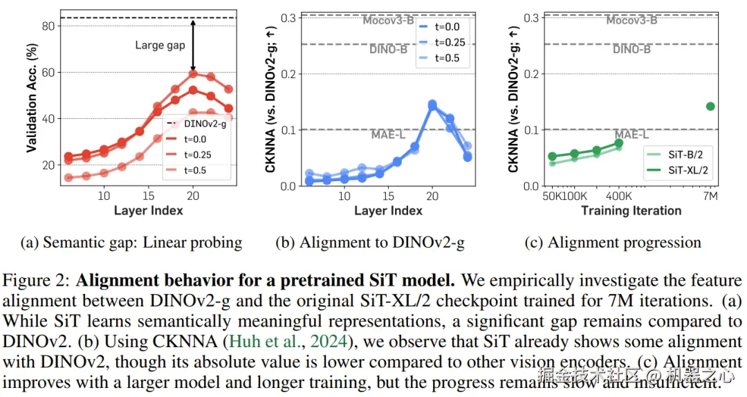 他们研究了在 ImageNet 上预训练得到的 SiT(可扩展插值 Transformer)模型的逐层行为,该模型使用了线性插值和速度预测(velocity prediction)进行训练。他们研究的重点是扩散 Transformer 和当前领先的监督式 DINOv2 模型之间的表征差距。他们从三个角度进行了研究:语义差距、特征对齐进展以及最终的特征对齐。