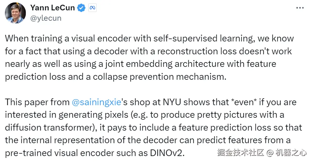 Yann LeCun 也对他们的研究表示了认可:「我们知道,当使用自监督学习训练视觉编码器时,使用具有重构损失的解码器的效果远不如使用具有特征预测损失和崩溃预防机制的联合嵌入架构。这篇来自纽约大学 @sainingxie 的论文表明,即使你只对生成像素感兴趣(例如使用扩散 Transformer 生成漂亮图片),也应该包含特征预测损失,以便解码器的内部表征可以根据预训练的视觉编码器(例如 DINOv2)预测特征。」