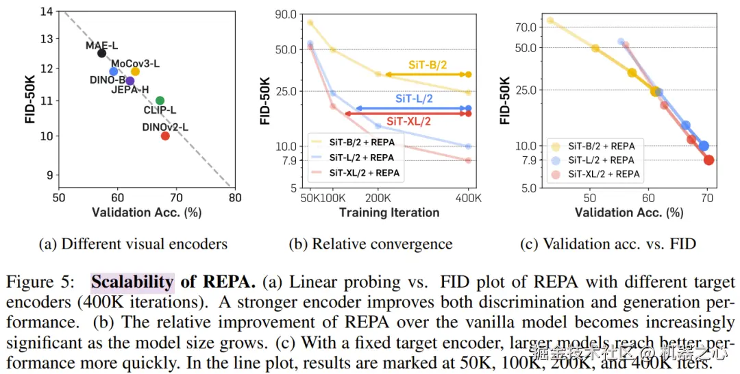 REPA 还在大型模型中提供了更显著的加速,与普通模型相比,实现了更快的 FID-50K 改进。此外,增加模型大小可以在生成和线性评估方面带来更快的增益。