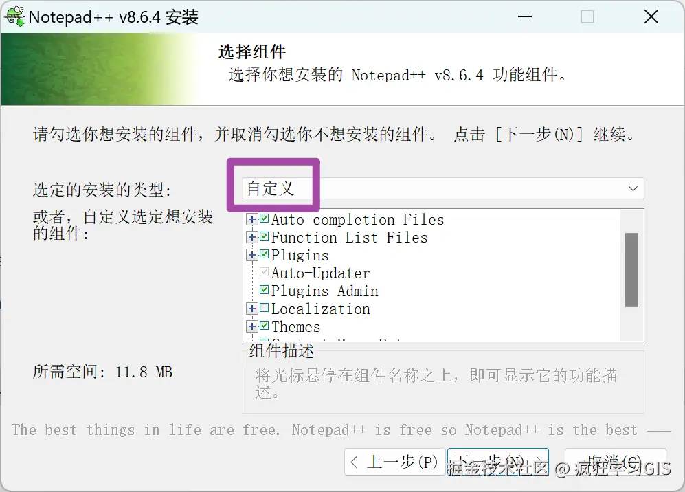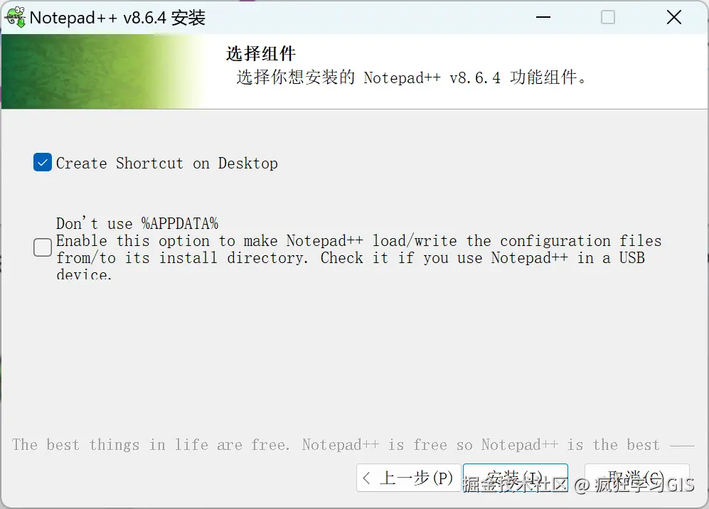 随后,在又一个“选择组件”界面,如果大家的Notepad++ 软件,将来主要是放在U盘上用(方便在多台设备之间切换),就选中第二个勾选项——这样的话,软件的各项参数信息、设置信息等,都会直接存在安装路径下,也就是说在不同电脑上打开U盘里的这个软件,各项参数配置都是一样的;如果是安装在自己的电脑上,那么就不用勾选。如下图所示。