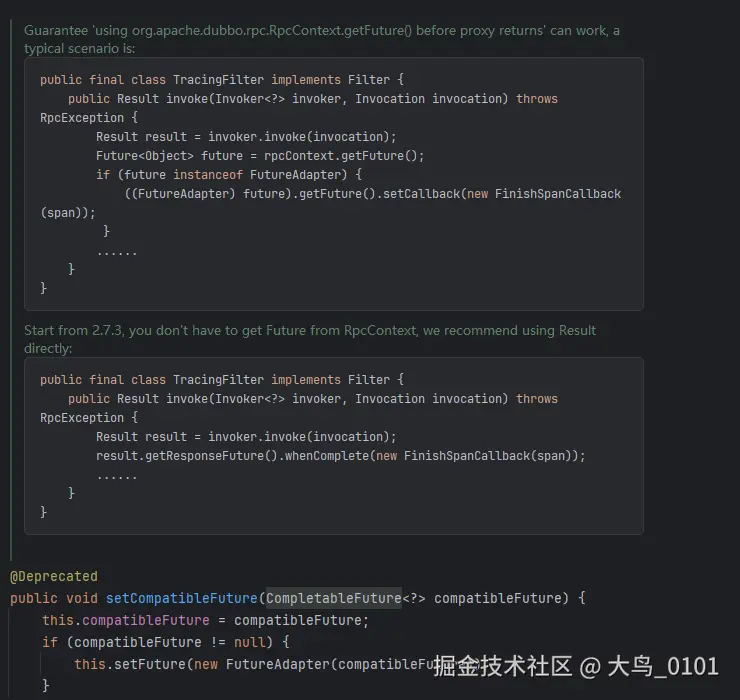 可以看到dubbo的注释 这个类 用法类似 consumer异步调用 做链路跟踪时,需要对异步结果进行监听