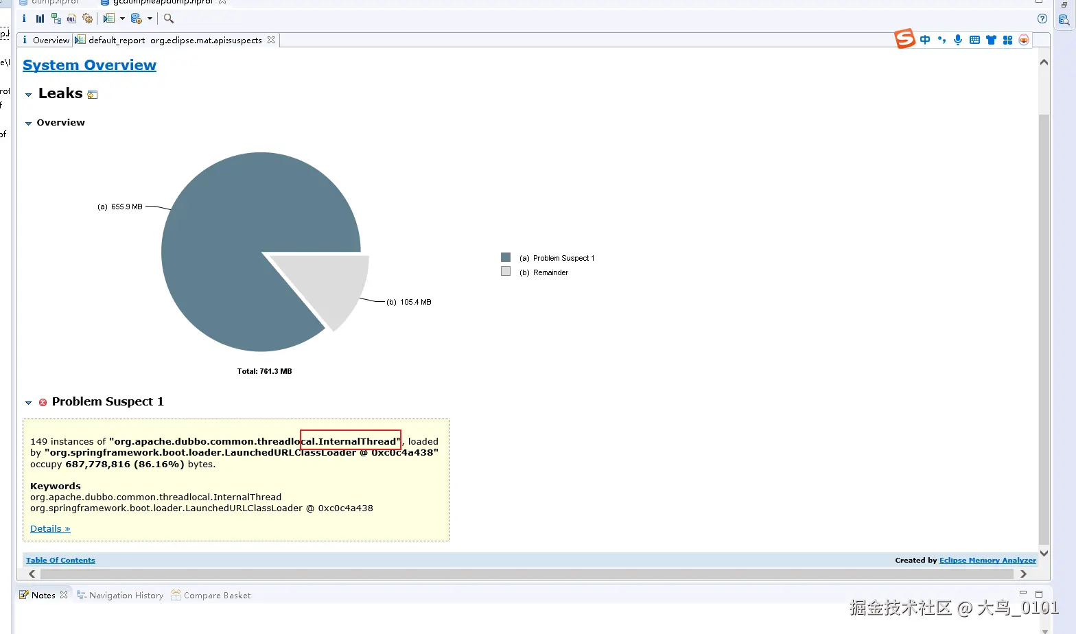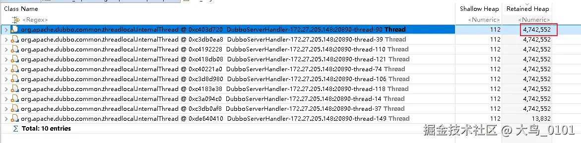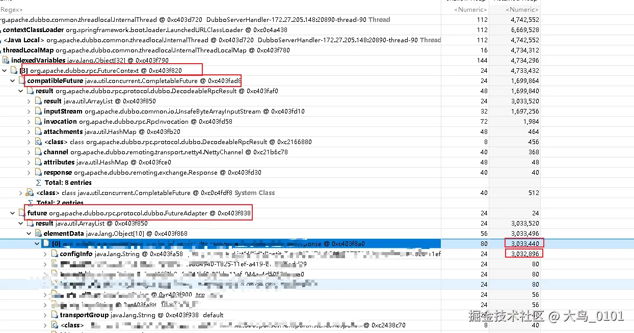 我们最终发现了那个大对象是哪一个,但是问题的根本原因不是这个,大对象只是诱因。我发现这个是大对象是一个rpc请求返回的响应结果,所以应该是朝生夕死啊,按道理就算是大对象,上一次full gc应该就把这种对象的内存给释放了啊,为什么没有释放呢?神奇神奇神神奇,来我们继续分析从截图来看我们发现了一个重要信息