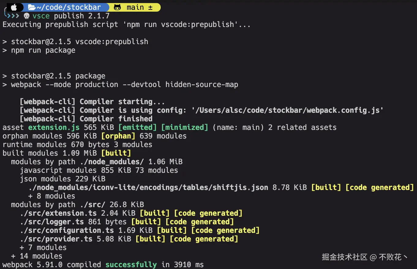 注意:这里 vsce 是一个 npm 包,可通过npm i -g vsce安装到全局。