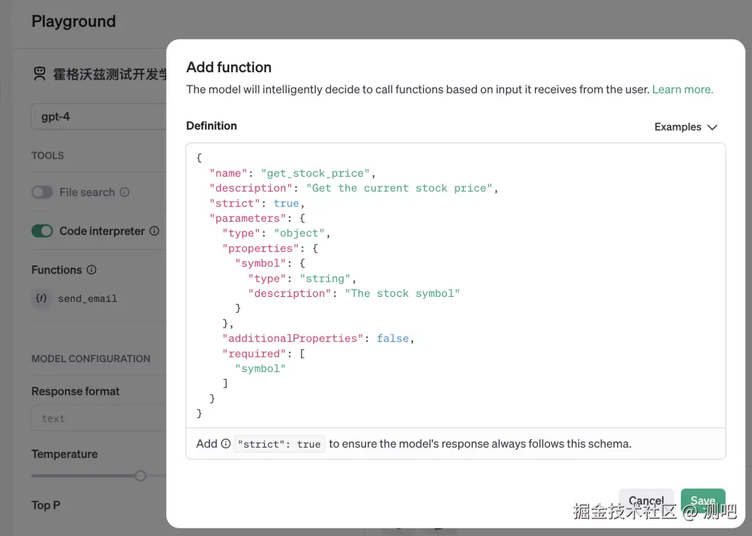 助手 API 支持函数调用。函数调用允许您向 Assistants API 描述函数,并让它智能地返回需要调用的函数及其参数。