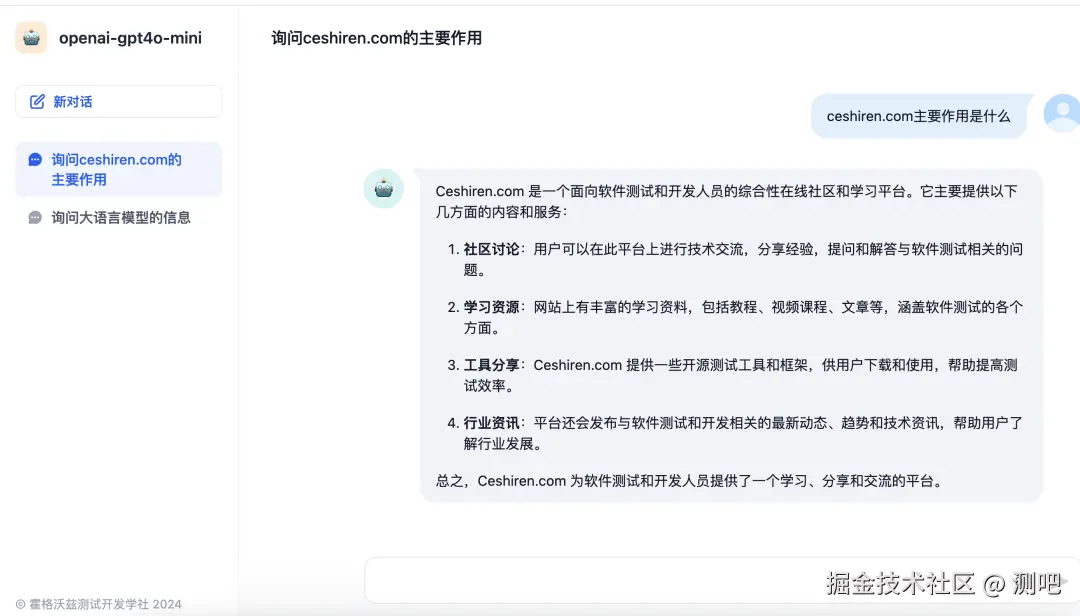 openai api chat.completions.create -m gpt-4o-mini -g user ceshiren.com是做什么的