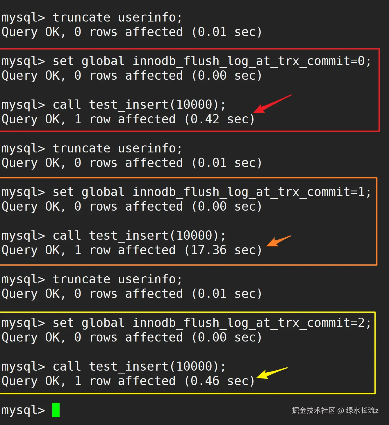 为0时,后台线程每隔1秒进行一次重做日志的刷盘操作。在这种情况下,MySQL宕机最多丢失1s内的事务数据,这种方式效率最高,但是安全性最低。