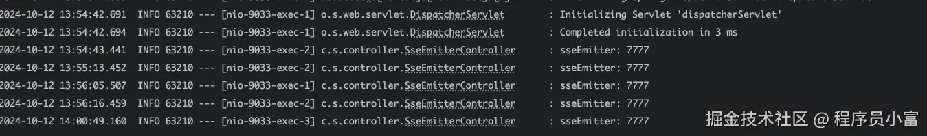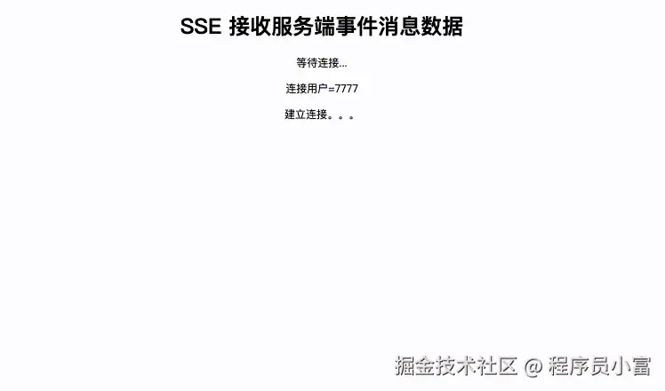 接下来向 userId=7777 的用户发送消息,127.0.0.1:9033/sendSseMsg/7777?msg=欢迎关注-->程序员小富,该消息可以在页面上实时展示。