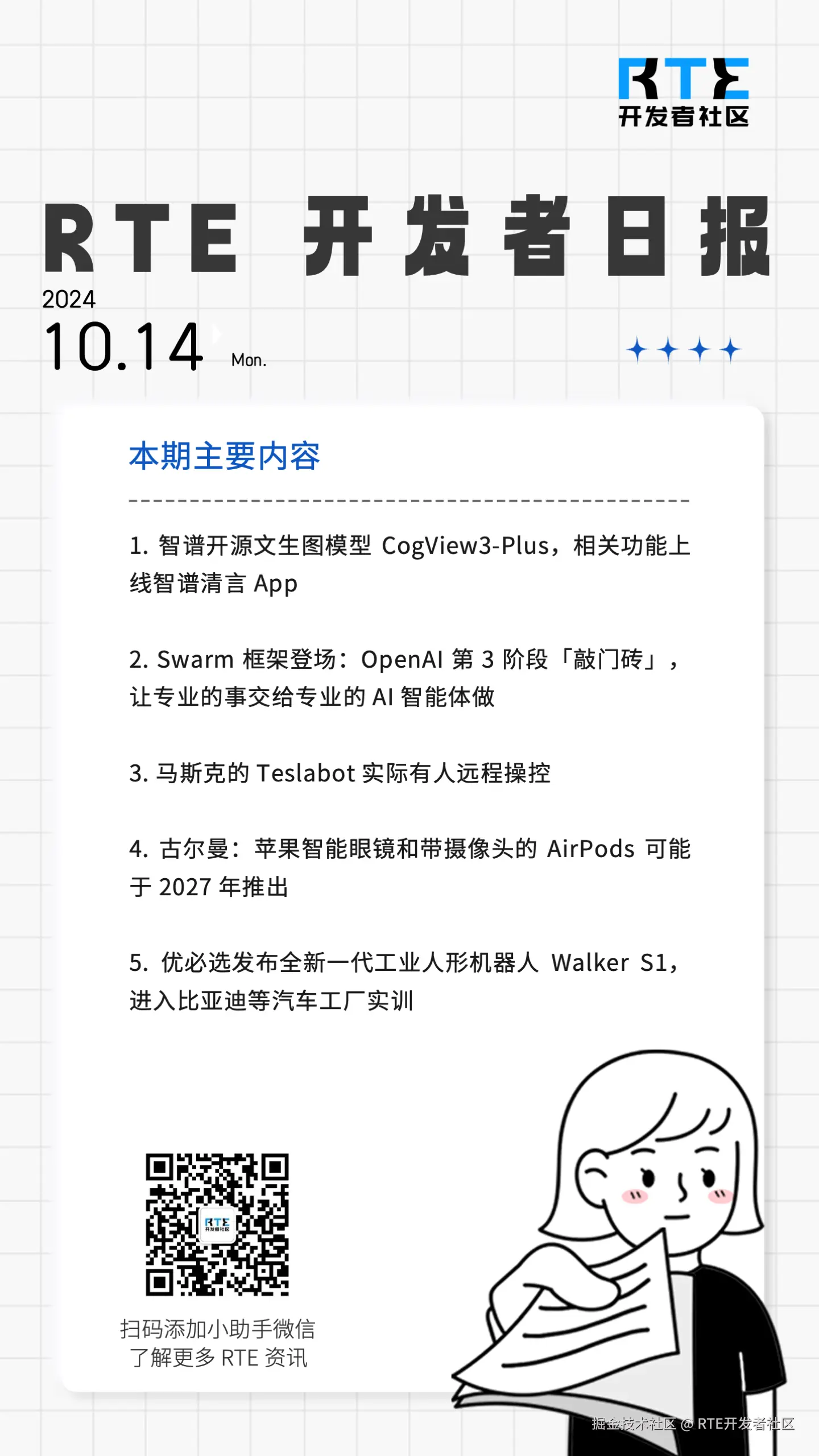 我们欢迎更多的小伙伴参与「RTE 开发者日报」内容的共创,感兴趣的朋友请通过开发者社区或公众号留言联系,记得报暗号「共创」。