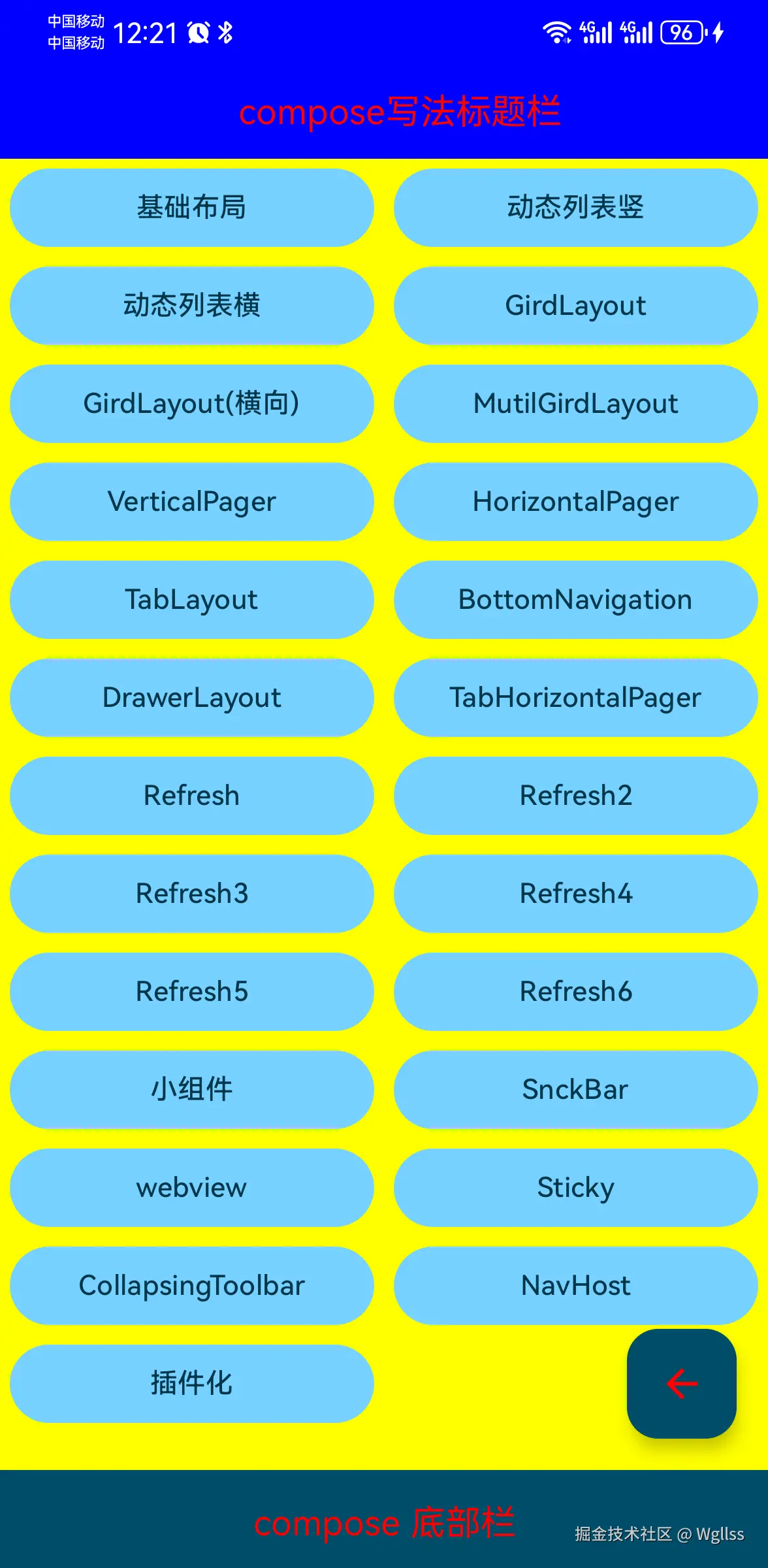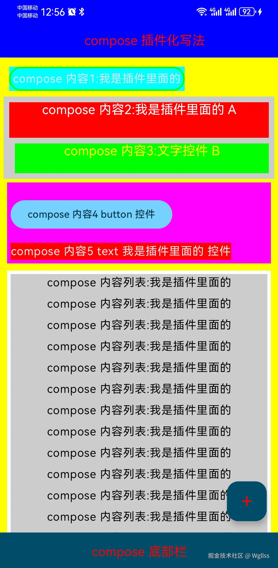 查看效果先运行安装debug包,打开插件页面然后其在手机的data/data/com.wx.compose.plugin/files/d_dex/下上传 我们的 compose_plugin_lib_dex插件到手机, 就可以看到效果啦 如下图: