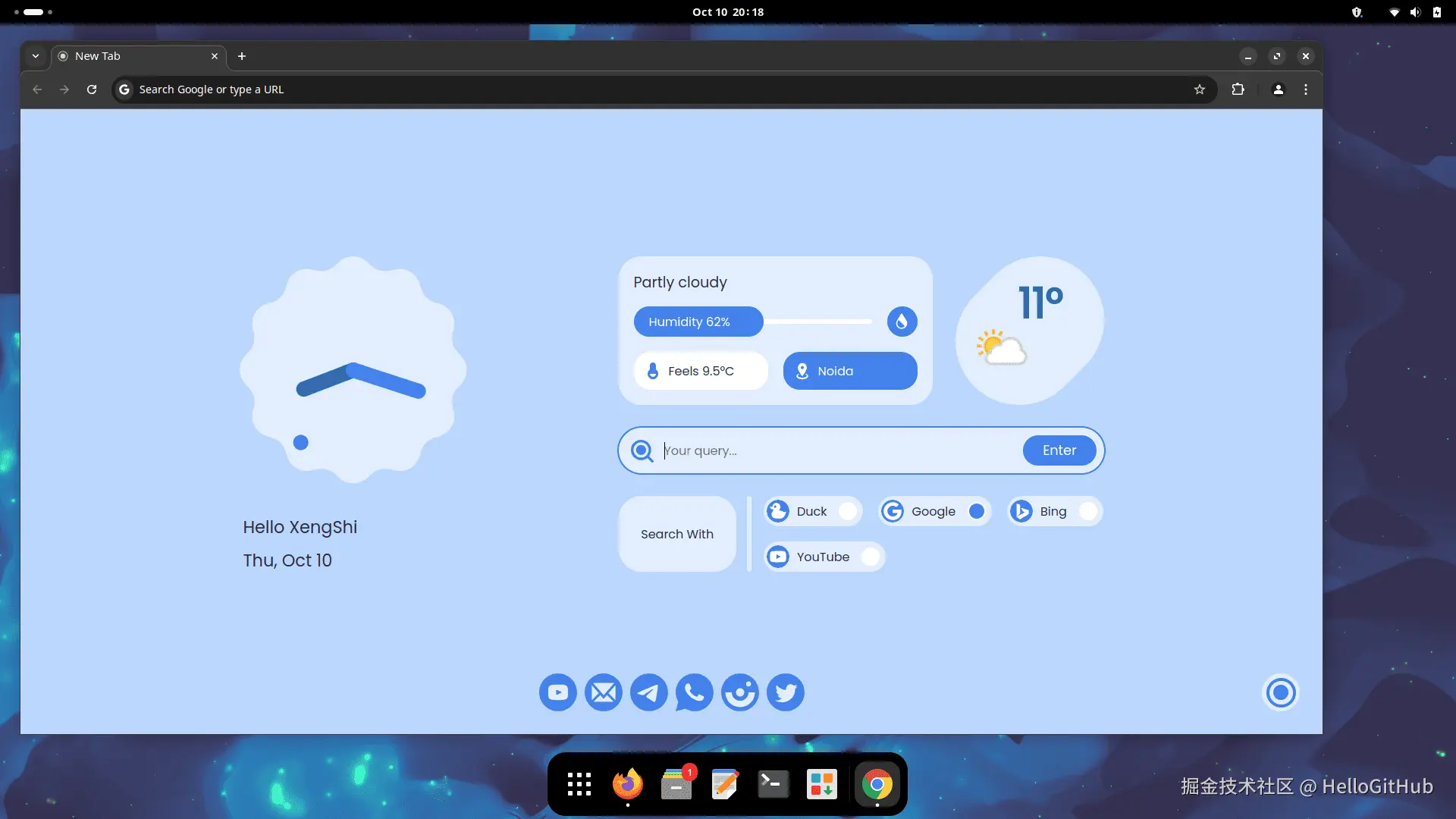 这是一款受 Google 的 Material You 设计语言启发的新标签页浏览器插件,注重简约和实用,拒绝花里胡哨。它为用户提供了一个清新美观的浏览器新标签页,支持多种主题和实用工具。