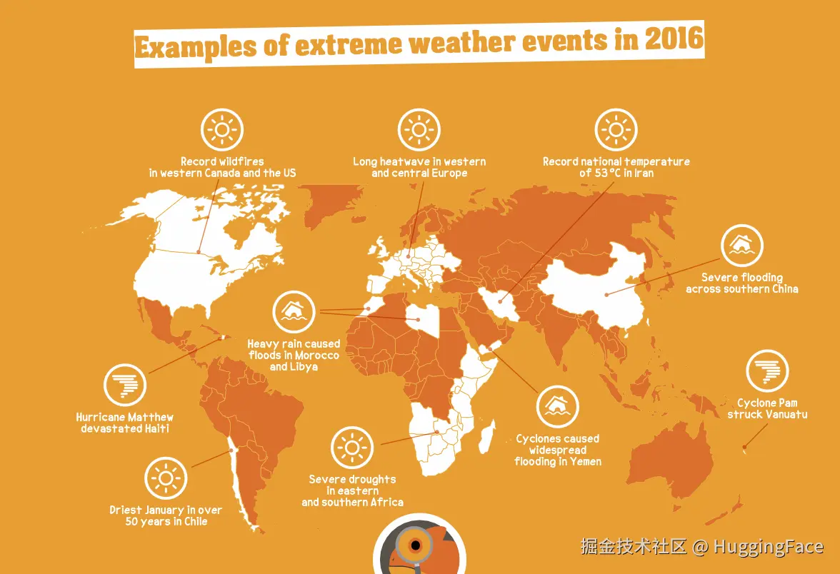 | 根据这张图表,干旱发生在什么地方? 2016 年干旱区域: 根据图表,2016 年发生干旱的地区有两个: * 东非和南非: 该地区经历了严重的干旱。 * 智利: 智利在 1 月份经历了 50 多年来最干燥的天气。这些地区在那段时间面临严重的水资源短缺问题。 | |
