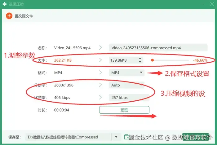 为了应对视频压缩的需求,数据 蛙视频转换器由此而生。它支持多种视频格式的转换,也支持mp4压缩、剪辑、合并等多种编辑功能。软件界面友好,操作简便,用户可以轻松上手进行视频处理任务。它还具有高效的压缩算法,能够在不显著降低视频质量的前提下,快速减小视频文件的大小。