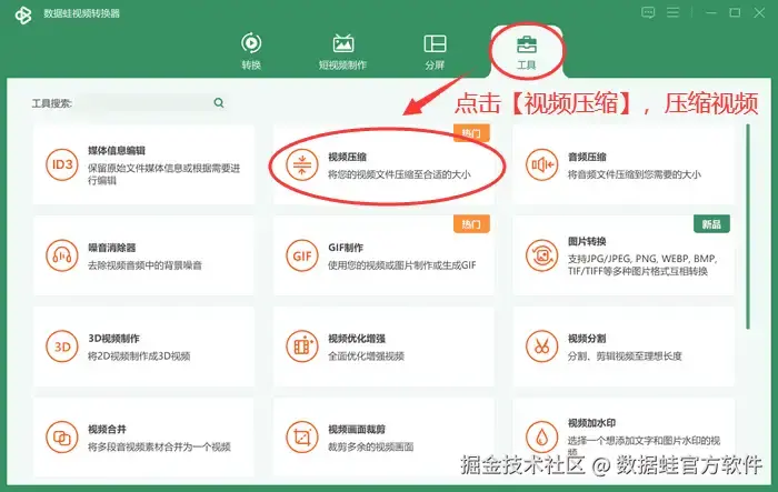 第一步: 首先打开数据 蛙视频转换器,打开 【工具】 ,点击选择 【视频压缩】 。