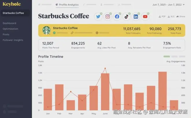 Keyhole的核心功能是帐户的社交媒体分析和报告。用户可以实时监控所有帐户和帖子,并使用Keyhole的分析来优化发布计划。除此之外,我们还可以实时监控主题标签和关键字,监控帖子总数、参与率以及博文产生的总覆盖面和展示次数。