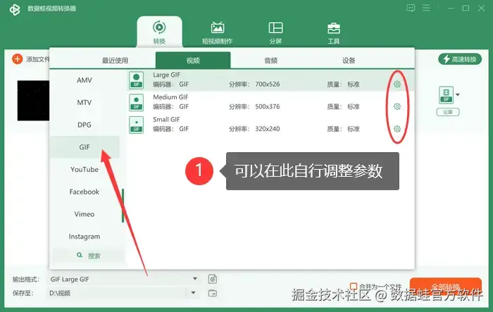 步骤二: 在软件界面中找到输出格式选择区域,在 【视频】 中选择 【gif】 作为目标格式。根据需要调整gif的参数,比如分辨率、帧率等。