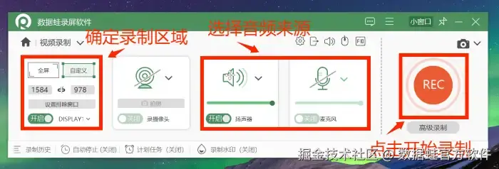步骤3: 确定好录制区域 (全屏或部分屏幕) 、声音来源 (电脑音频或外部麦克风) 、视频格式、画质等参数。然后点击 “REC” 按钮开始录制。