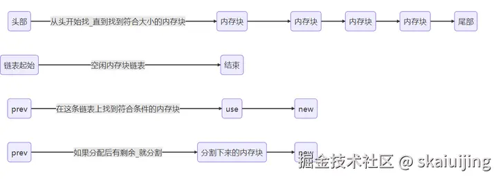 在初始化后,空闲内存块已经形成了一条链表,这条链表被称为空闲内存块链表,内存块被使用就被踢出这条链表,被释放就加入这条链表,如果内存块大于要申请的大小,就把多余的部分切割,然后加入这条内存链表。