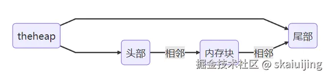 简单来说,就是我们要在大内存数组起始地址和终结地址分别创建两个heap_node节点,用于管理这个内存块,然后将它们使用指针连起来,还记得上一篇博客中我们定义的theheap吗?它负责记录头部和尾部。