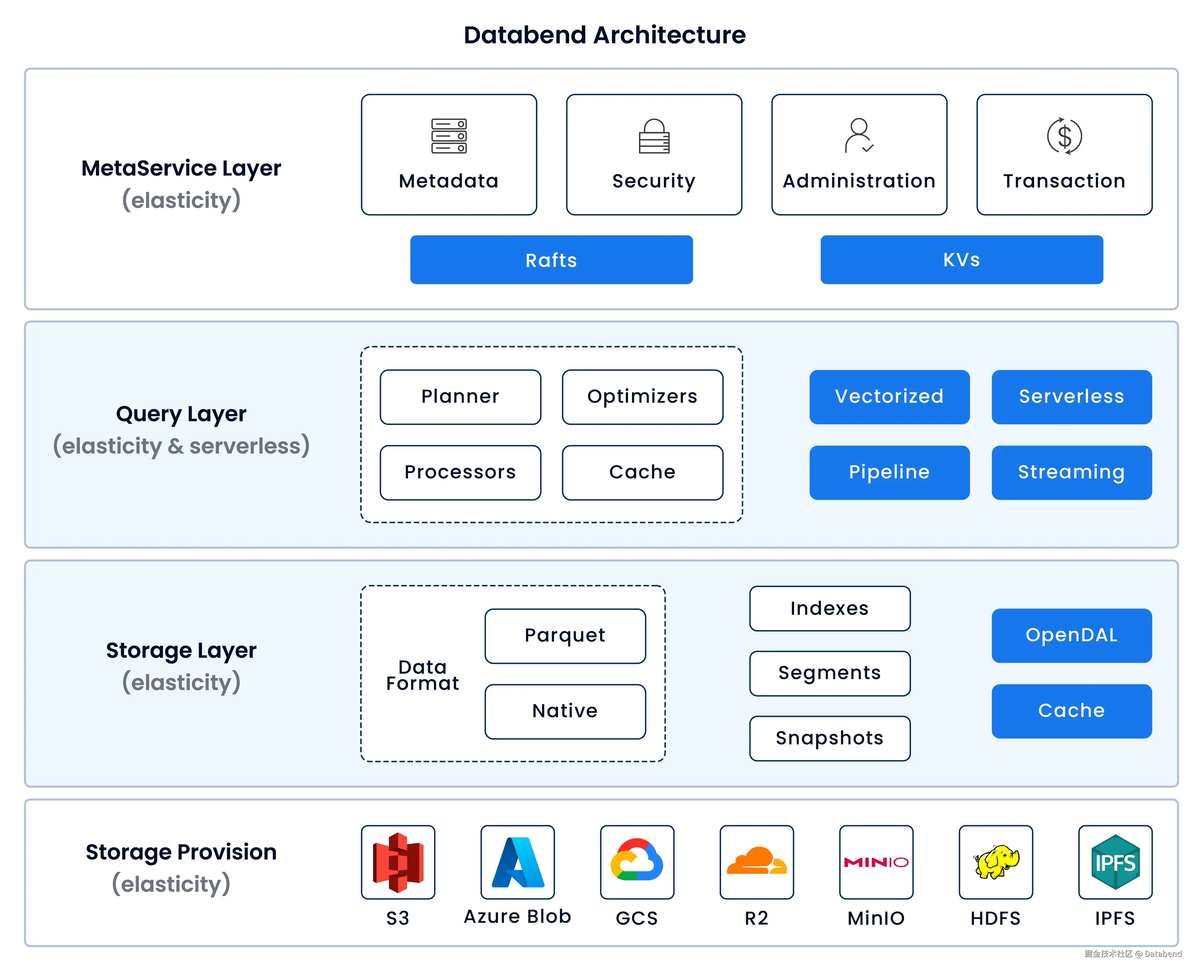 Databend 与上述云原生数据库类似,采用了存算分离的设计思路,但在架构细节上进行了优化,以更好地适应大规模、动态变化的云端环境。