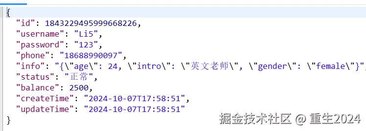 user.setInfo("{"age": 24, "intro": "英文老师", "gender": "female"}");