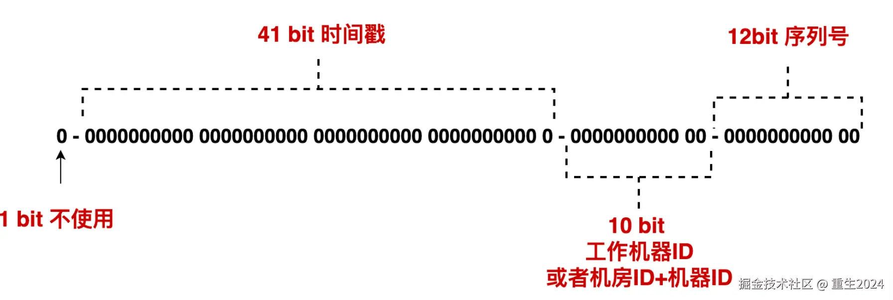 雪花算法是 64 位 的二进制,一共包含了四部分:
